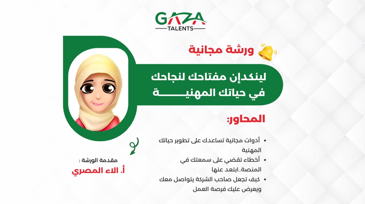 A free training workshop organized by the Gaza Talents platform, presented by trainer Alaa Al-Masry, on LinkedIn: Your Key to Professional Success